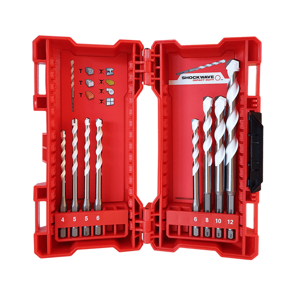Equipped with a 1/4" hex shank, these multi-material drill bits are compatible with impacts, drill/drivers, and hammer drills. MILWAUKEE® SHOCKWAVE™ Multi-Material Drill Bits provides the ideal all-in-one solution for the widest variety of materials, tools, and applications, sizes available from 3mm to 12mm.