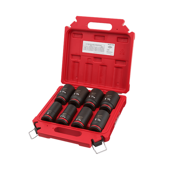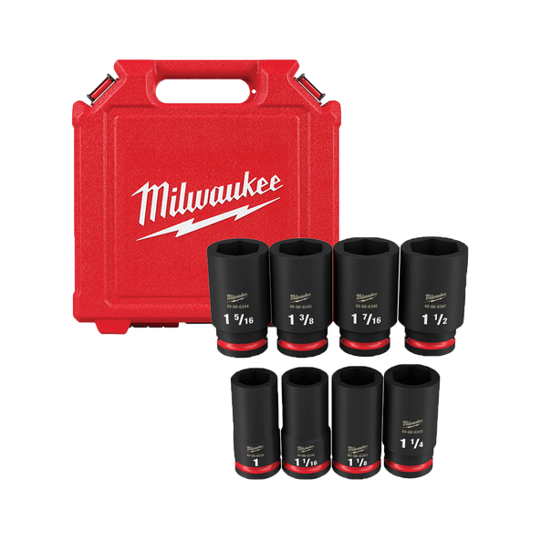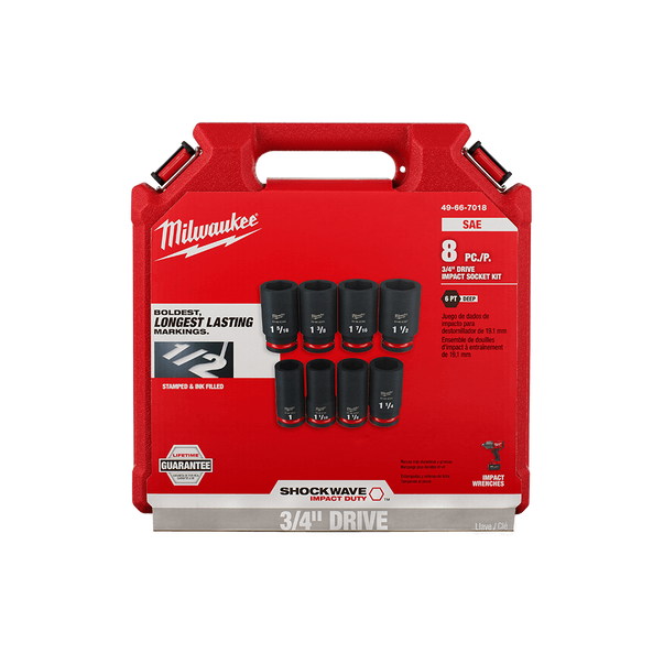 The MILWAUKEE® 8 Piece SHOCKWAVE Impact Duty™ 3/4" Drive Deep Socket Set features the boldest, longest-lasting markings and extreme impact durability in high torque applications. The stamped and ink-filled size markings make it easy to select the right socket every time throughout the life of the socket. Engineered with high strength forged steel for optimised performance in heavy-duty applications, and a non-slip hex geometry prevents fastener rounding.